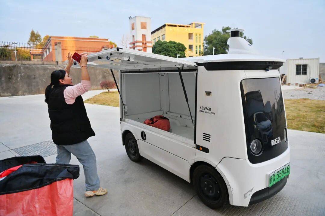 抵达梅山仓储中心后,工作人员陈女士打开手机终端App,简单操作几下,无人快递车便自动展开一侧车门。陈女士取出快件并关好车门后不久,无人快递车便自行返回。
